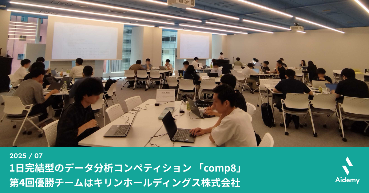 デジタル変革に伴走する株式会社アイデミー(本社:東京都千代田区、代表取締役 執行役員 社長 石川聡彦、以下「アイデミー」)は、法人向けのAI/DX人材育成e-learning「Aidemy Business」の受講を通しデータ分析や機械学習について学びを深めた人材を対象に、会場に集まって行う1日完結型のデータ分析コンペティション「comp8(こんぺいとー)」を2025年7月に開催いたしました。第4回目となる今回の「comp8」には、9チームが参加し、キリンホールディングス株式会社からの参加チームが優勝しました。アイデミーは、「Aidemy Business」での学習成果を実践する機会として、同コンペティションを今後も継続的に開催してまいります。